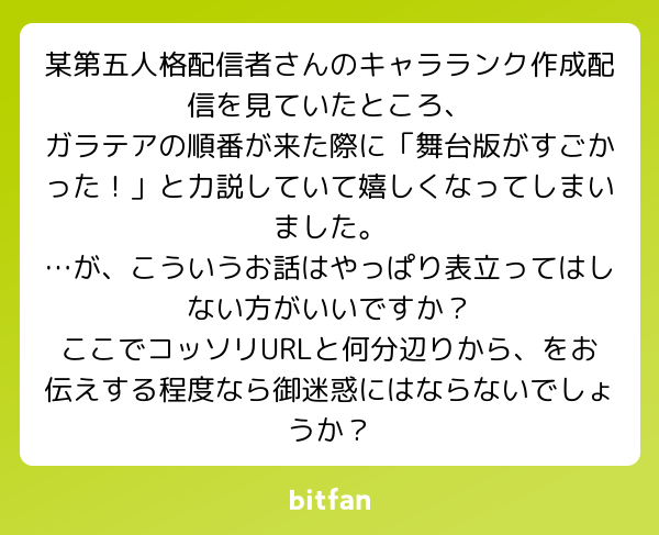 質問 匿名希望 2026/01/06 21:40 Bitfan IDでログイン パスワードを忘れた方はこちら ログインできない場合 ログインしたままにする または Xでログイン Facebookでログイン Bitfan IDとは Bitfan IDを未登録の方 Bitfan IDとは何ですか Bitfan IDは本サービスを利用するために必要なアカウントとなっております。 外部SNSアカウントを利用したご登録、または任意のメールアドレスとパスワードを利用したご登録ができます。 質問・リクエストを送る URLをコピーする 報告する